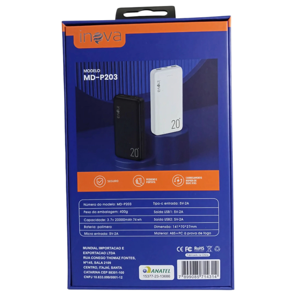- Capacidade: 3.7V 20000mAh 74Wh